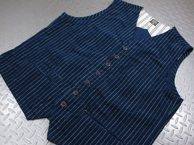 現代の大量生産や合理化の波によって失われてしまった、本物の ヴィンテージウェアのみが持つワークウェアの魅力を、余す事無く 手間を惜しまず現代に蘇らせた、シュガーケーンの 「クラシックなのに新しい」注目の新シリーズです! こちらは、 14ウェルのコットンコーデュロイをインディゴ染めし、ドット ストライプに抜染プリントしたシュガーケーンオリジナルの 生地を使用したワークベスト。